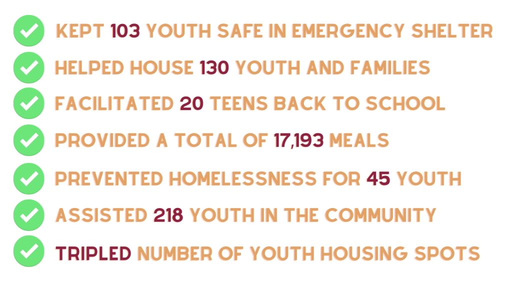 Thanks to an outpouring of support from our amazing community (YOU!), we were able to keep youth and families experiencing homelessness as safe as possible by enabling social distancing in emergency shelter, supplying all necessary PPE, providing free wifi and devices to youth, providing hundreds with emergency supplies, running art and wellness programming, AND helping to coordinate a vaccination clinic for our clients!